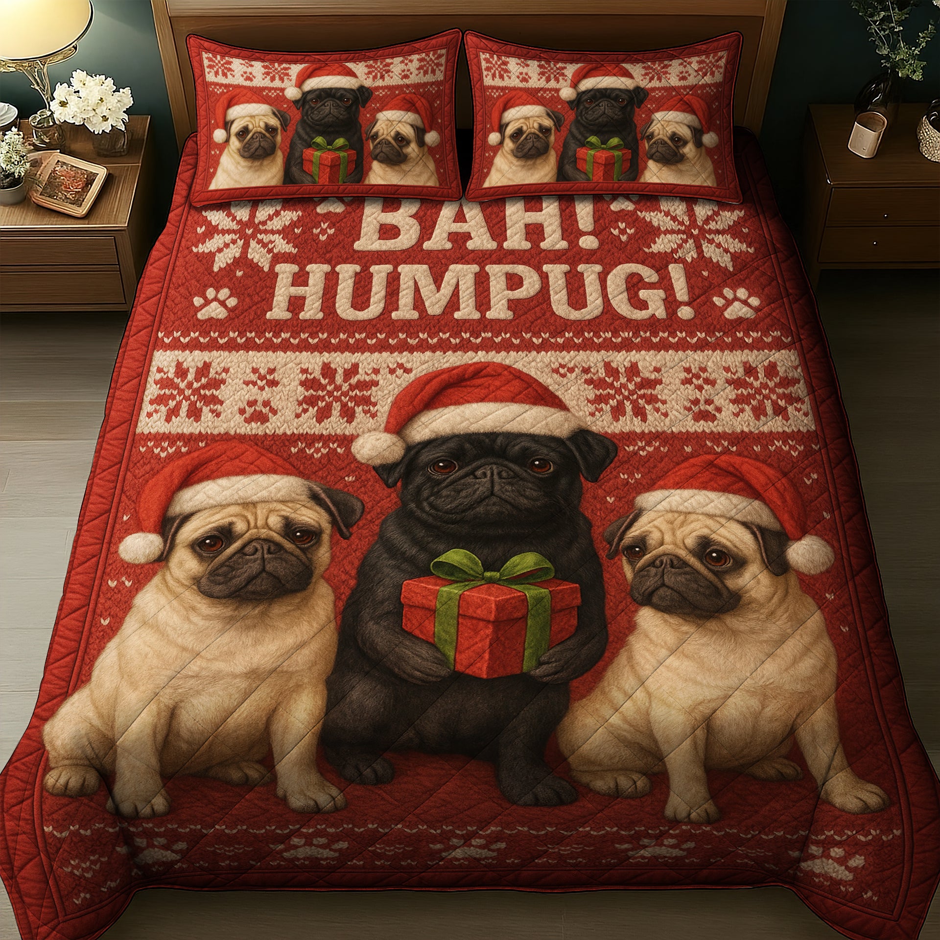 Bah Humpug Funny Pug Christmas Quilt Set, Cute Holiday Bedding Gift for Dog Lovers, Pugmas Bedroom Decor