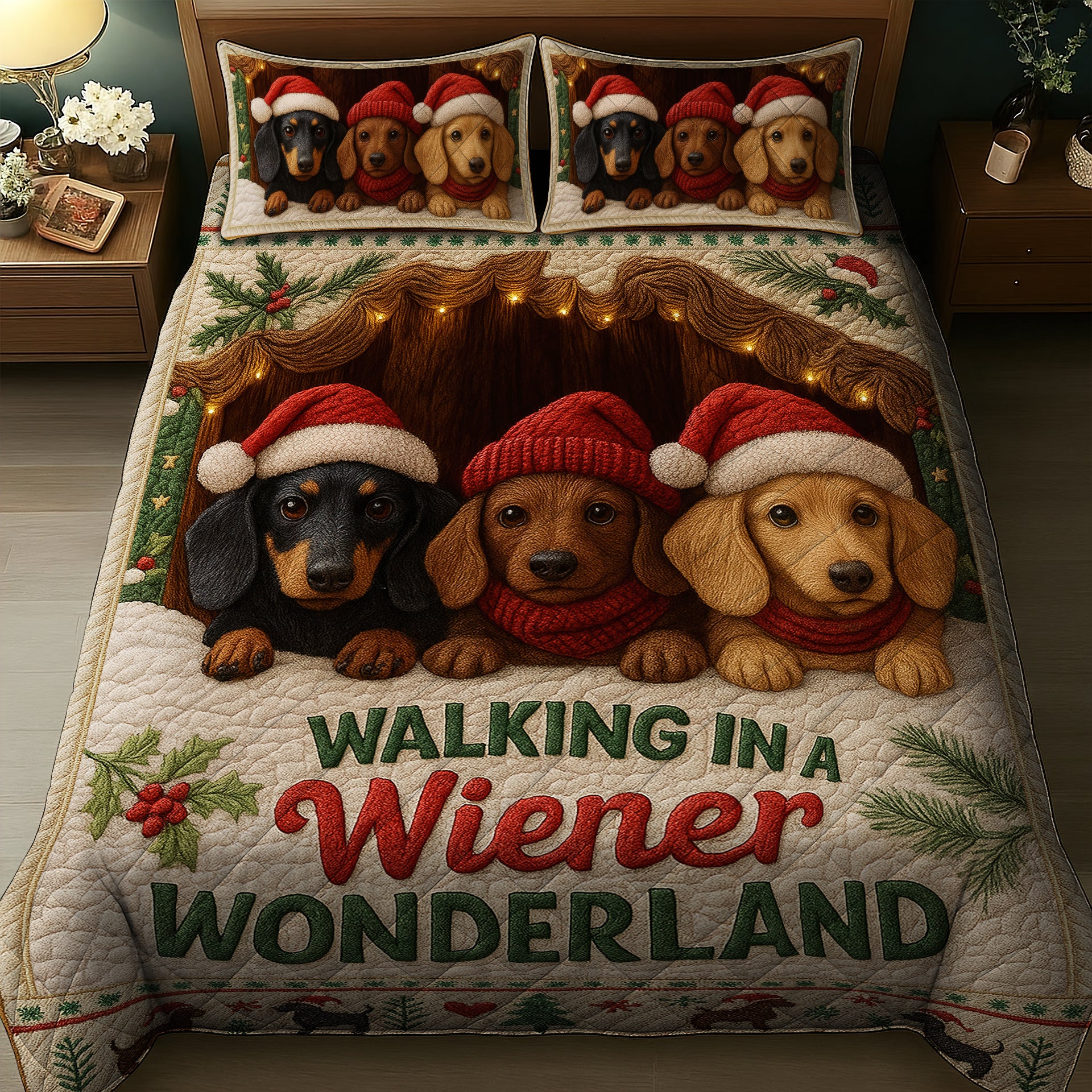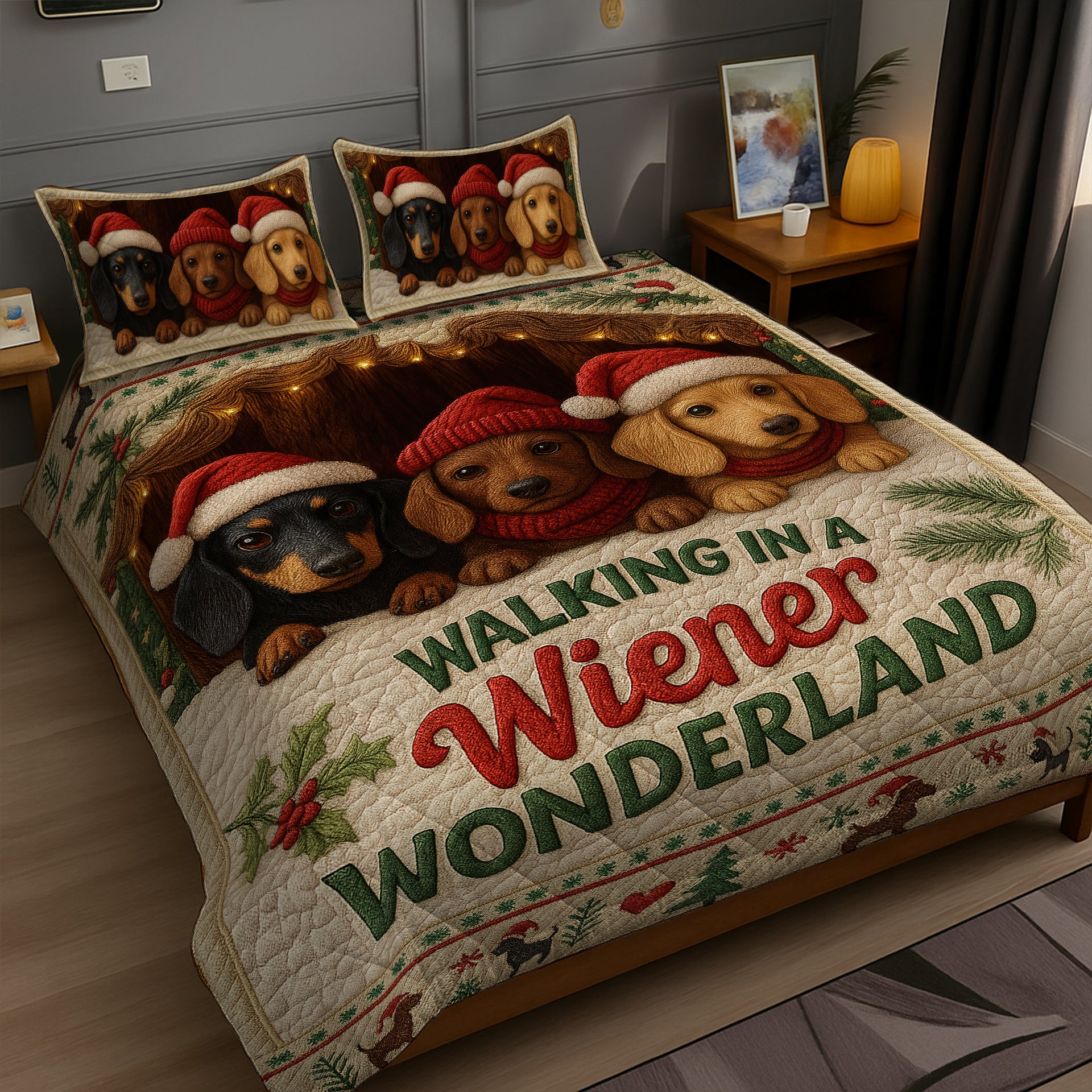 Funny Dachshund Wiener Dog Quilt Set, Cute Christmas Bedding Gift for Dog Lovers